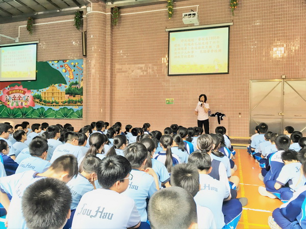 班會在悠揚的校歌聲中拉開帷幕,我們邀請了資深的馮鈺華老師為同學們講述勞校的歷史。馮老師用風趣的語言娓娓道出勞校的今昔,同學們聽得津津有味。轉眼,最具吸引力的環節──有獎搶答開始了,屏幕上一道道關於學校歷史的問題把全場的氣氛推向高潮,一隻隻躍躍欲試的小手,一雙雙充滿期盼的眼睛,無不印證着同學們對這些歷史已經了然於胸,一份份禮品被順利送出。最後,班會在同學們的意猶未盡中結束。