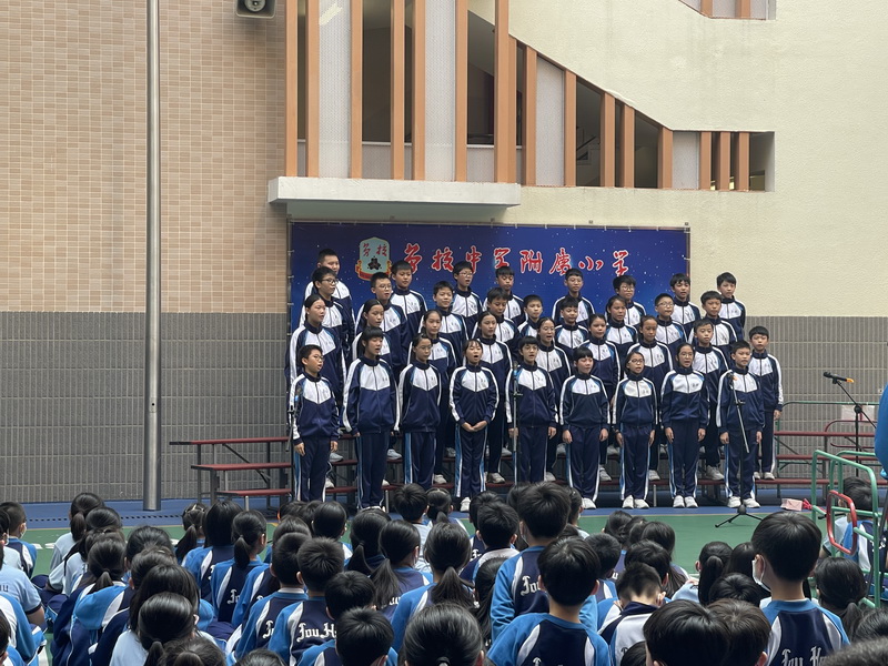 隨著疫情的穩定,防控政策的開放,勞校中學小學部英文科為了鼓勵同學們對英文學習的熱愛,提高對英文學習的興趣,培養良好的英文語感,發展同學們的英文潛能,2月24號下午,在學校籃球場舉辦了‘英語之聲’班級英文集誦比賽。比賽分低小和高小兩場,全體英文老師及學校行政當評委,各年級由英文任課老師推薦三個班級參加比賽。根據一年級小朋友的個性發展特點,他們進行英文歌曲表演。賽場上,觀眾席的同學們在籃球場,在春天的懷抱中,帶著溫暖的微笑、期待的眼神席地而坐,靜待比賽。